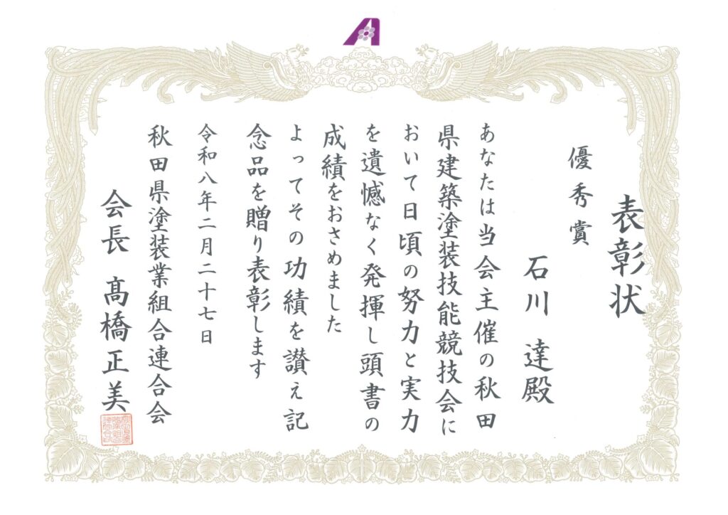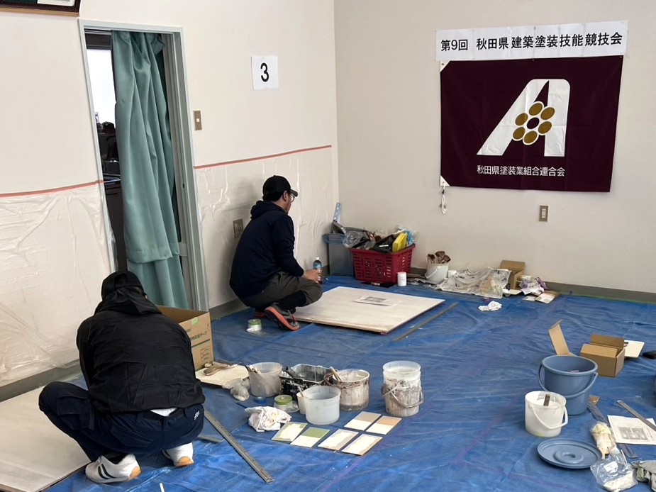 令和8年1月28日に秋田県塗装業組合連合会が主催する「第9回 秋田県建設塗装技能競技会」が秋田塗装会館で開催されました。弊社から1名が技能競技会に参加し、優秀な成績をおさめることができました。